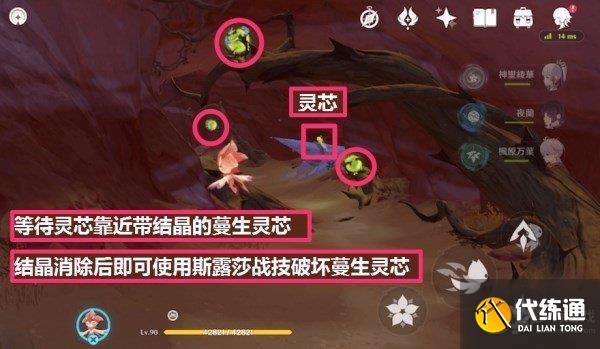 此处的蔓生灵芯被结晶覆盖了,需要利用移动的灵芯清除结晶才能使用斯露莎的技能。切换至斯露莎后跟随灵芯的移动方向前进,逐一破坏3个蔓生灵芯即可获得宝箱。
