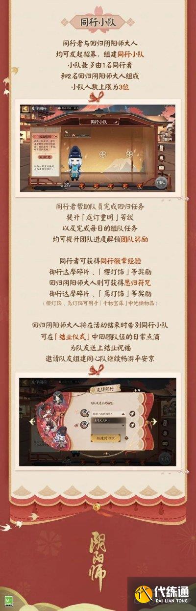 同行小队:同行者与回归阴阳师大人可组建「同行小队」,同行者帮助队员完成回归任务以及完成每日的组队任务,可提升团队进度解锁团队奖励,同行者可获得同行徽章经验、御行达摩碎片和「樱灯饰」等奖励,回归阴阳师大人则可获得思归符咒、御行达摩碎片和「鸢灯饰」等奖励。
