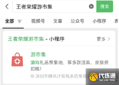 1、打开微信,在上方搜索框中输入【王者荣耀游市集】,就可以看到有相关的小程序;