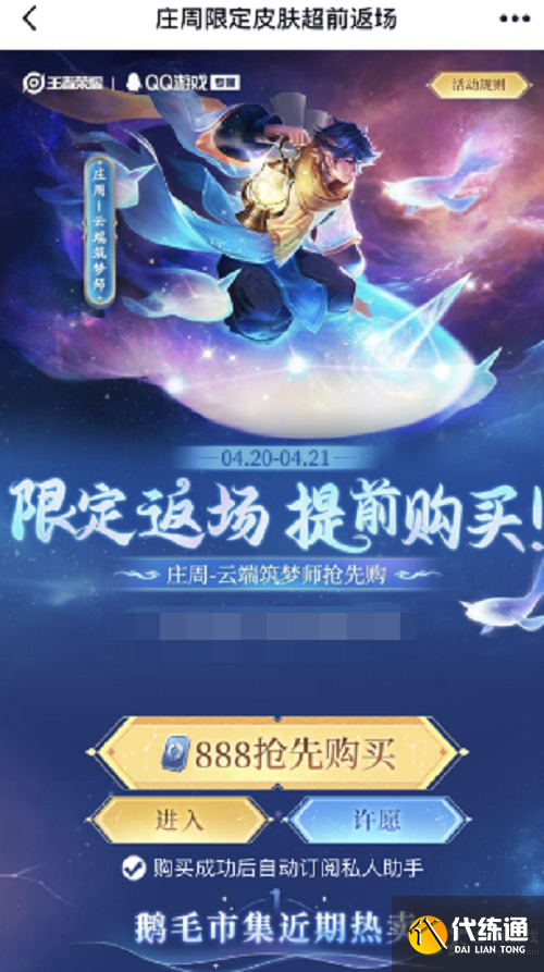 王者荣耀庄周筑梦师返场怎么提前买 王者荣耀2023庄周筑梦师皮肤返场提前购买教程