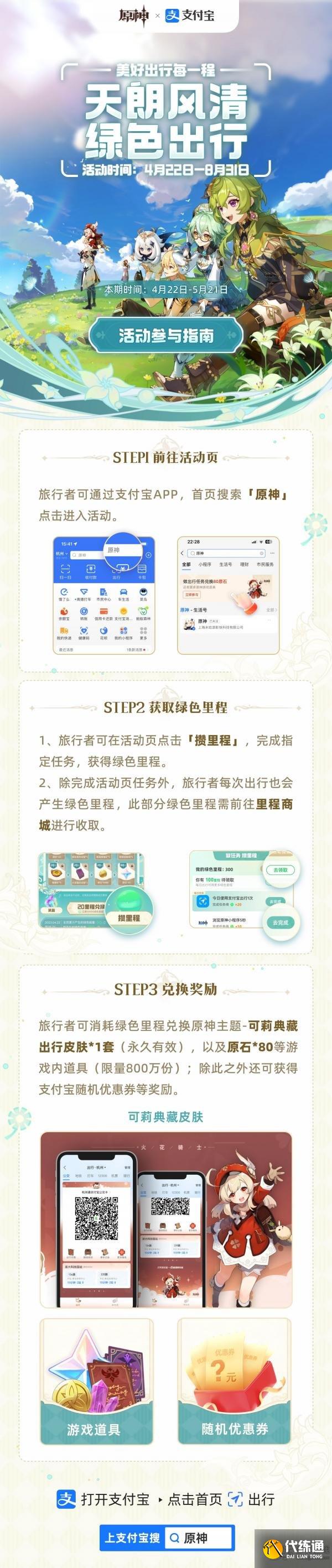 去年原神与支付宝开启了联动,而今天2023原神又再次和支付宝开启了绿色出行活动,完成活动即可获得原石以及可丽支付宝皮肤奖励,现在就和小编一起来看看原神支付宝绿色出行活动2023吧。