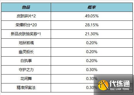 购买礼包必得红蓝对决(1日),可额外随机获得以下之一:地狱岩魂、幽灵船长、白执事、守护之力、花间舞、精准探案法、荣耀积分*20、新品皮肤抽奖券*1、皮肤碎片*2。