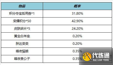 购买礼包必得酷炫机甲(1日),可额外随机获得以下之一:黄金白羊座、胖达荣荣、暗夜猫娘、暗夜贵公子、荣耀积分*50、积分夺宝抵用券*1、皮肤碎片*5。