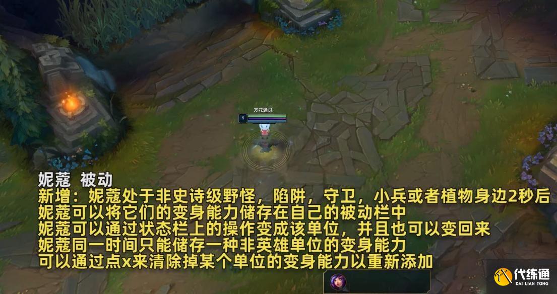 新增:妮蔻处于非史诗级野怪,陷阱,守卫,小兵或者植物身边2秒后,妮蔻可以将它们的变身能力储存在自己的被动栏中。
