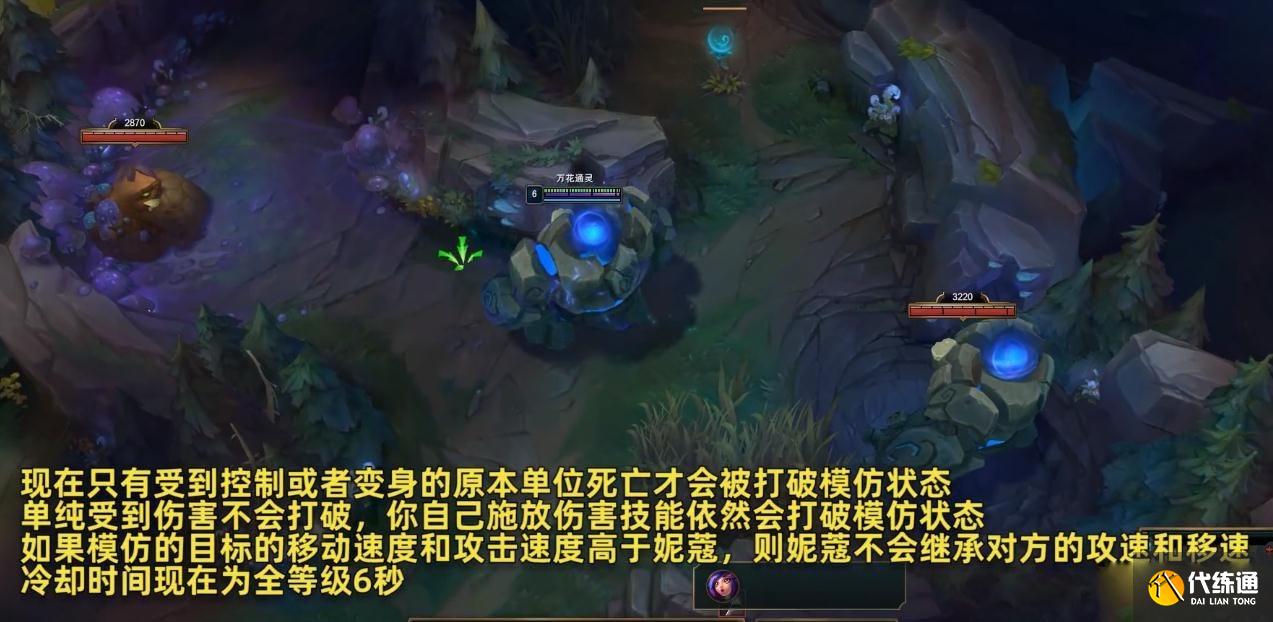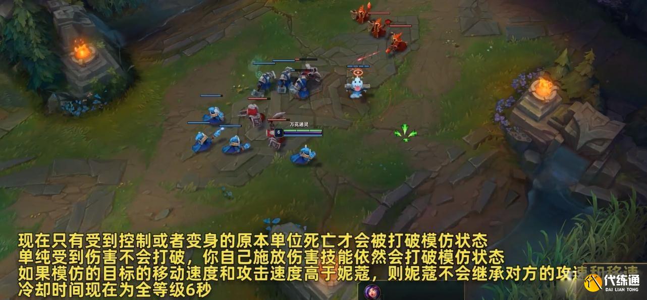 如果模仿的目标的移动速度和攻击速度高于妮蔻,则妮蔻不会继承对方的攻速和移速,冷却时间现在为全等级6秒。