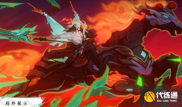 在形象的绘制上,展现关羽与梦马共同战斗的英姿。梦马鬣鬃的红色与百相脸谱的能量的青色一左一右形成撞色,富有张力的构图表现出关羽忠勇无畏的英雄气概。