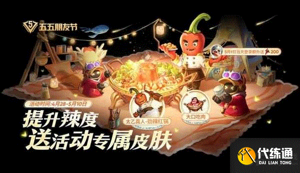①:免费皮肤——太乙真人-劲辣红锅:4月28号起即可开始做活动收集劲辣红椒,积累一定数量可免费兑换太乙真人的皮肤,同时在5月1号登陆游戏就可以领到200个劲辣红椒,能更快领到皮肤。