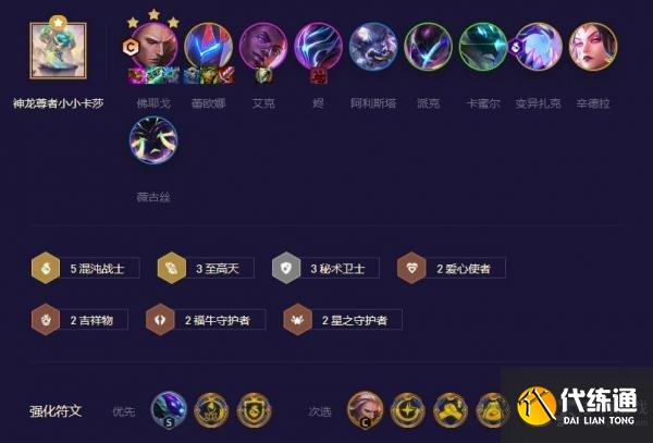 2、阵容羁绊:5混沌战士+3至高天+3秘术卫士+2爱心使者+2吉祥物+2福牛守护者+2星之守护者。