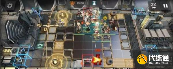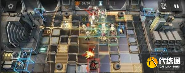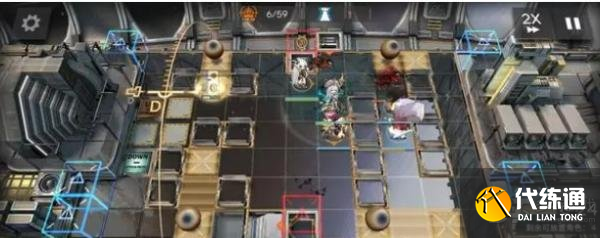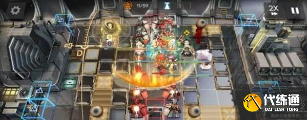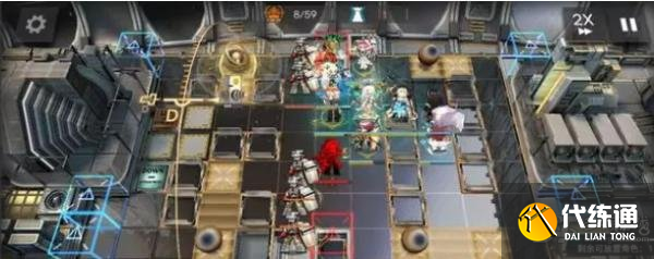 开局先在右侧部署桃金娘+伊内丝,然后左侧部署红蒂+能天使,能天使冲下攻击,接着在红点门口部署闪灵冲右侧攻击,再部署澄闪冲下攻击。