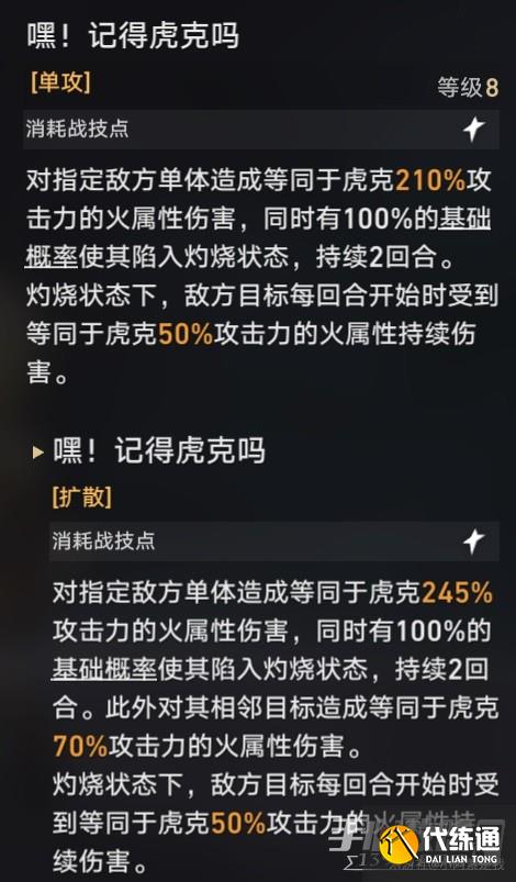 虎克大人是一位火属性的超高单体伤害角色,战技不但可以造成大量伤害,还可以附加灼烧,而且大招之后的第一次战技还有强化效果,可以扩散,对相邻的目标也能造成伤害。