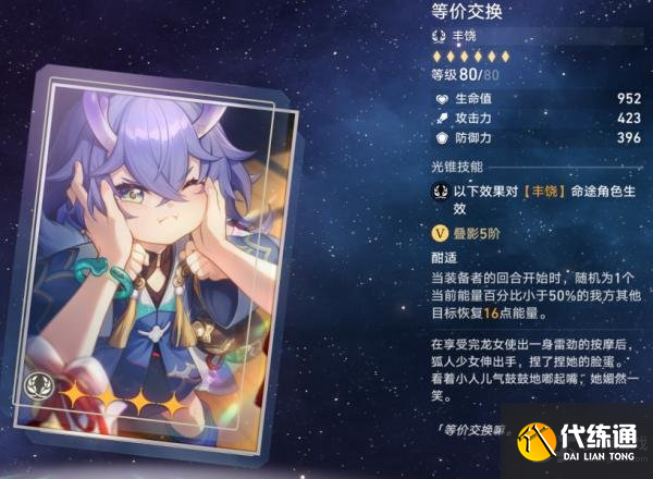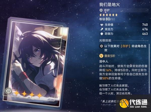 存护光锥:我们是地火,其特效为:战斗开始时,我方全体受到伤害降低8%/16%。同时为我方全体回复已损失生命值的25%/50%。伤害降低的特效能对友军起到不错的保护作用,但回血特效有些意义不明。但该效果只有五回合持续时间,在满星忘却之庭环境中倒是能全额吃满。而对于友军的保护,拥有嘲讽效果的光锥也能起到类似效果。