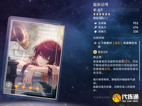 虚无光锥:延长记号,其特效为:装备者的击破特效提高16%/32%。对处于触电或风化的敌人造成伤害提高16%/32%,对持续伤害也会生效。