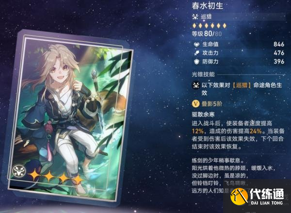 巡猎光锥:春水初生。其特效为:进入战斗和回合结束时,获得如下效果:速度提高6%/12%,造成伤害提高12%/24%。受到伤害后失效。速度和伤害的提升中规中矩,并不算非常突出。并且在受到攻击后效果还会丢失一回合,并不稳定。整体来看,春水初生的强度不足,不推荐换取。
