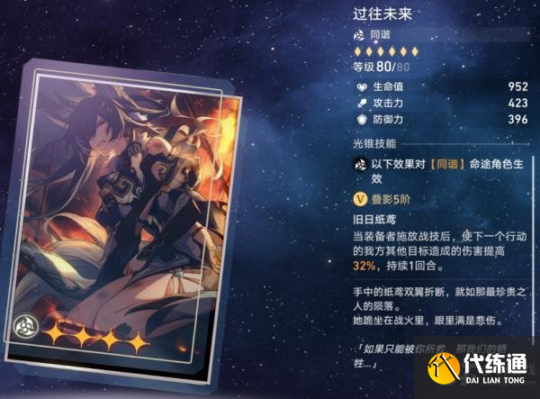 同谐光锥:过往未来。其特效为:装备者施放战技后,使下一个我方行动角色伤害提高16%/32%,持续一回合。非常适配布洛妮娅的四星光锥,满精时能提供高额单体增伤。在没有五星光锥且有布洛妮娅时,过往未来无疑是非常优秀的选择。而在给其他同协角色佩戴时,就需要考虑速度的调配问题。并且由于现阶段超强大C希儿的高速度特性,与该光锥调速极不适配(布洛妮娅除外)。由于其类似讨龙的特效,除非玩家可以完美调速,保证主C吃到增伤,否则不建议换取。有布洛妮娅且无布洛妮娅专武玩家,优先换取过往未来 (最高优先级)。