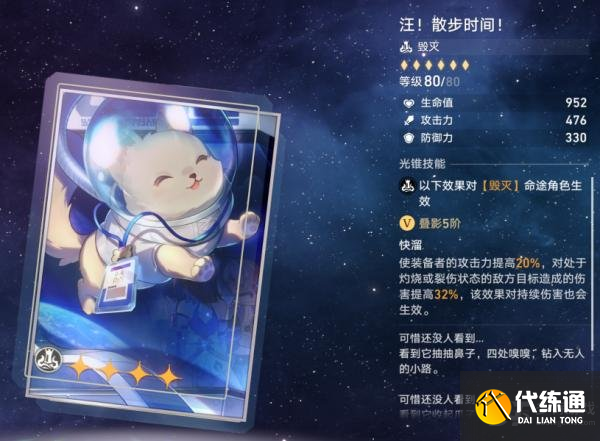 毁灭光锥:汪!散步时间!其特效为:装备者攻击力提升10%/20%,对处于灼烧或裂伤状态的敌人,造成伤害提高16%/32%。