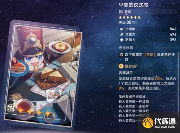 智识光锥:早餐的仪式感。其特效为:造成伤害提高12%/24%,每消灭一个敌人,攻击力提高4%/8%,最高叠加三层。满阶强度可观,击杀三个目标在现在多召唤物的环境下也并不难完成。并且特效通用,对所有智识角色都有不错的适配性。