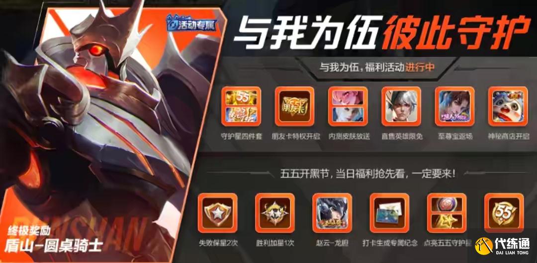 去年五五开黑节完成活动可以获得永久皮肤:盾山的「圆桌骑士」~官方刚刚宣布今年也将会有免费全新皮肤的活动上架,不过还没有公布皮肤是哪位英雄的,至于新皮肤的品质吧,大家参考盾山的的「圆桌骑士」就行,毕竟是免费活动的皮肤,对其要求也不能太高~