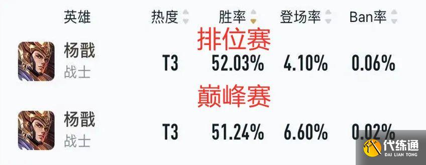 现版本更新后杨戬迎来了一次增强,整体强度有了很大的提升,因此胜率大幅度回暖。