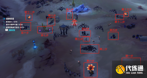 2、一、二、三、四、五、七、八、九、十、十二点位,使用苦离果轰炸油桶、水琥珀、电气水晶、荆棘、大锅就好,一共消耗十颗苦离果;