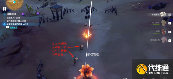 3、六、十一、十三的喇叭花:需要等丘丘人都聚在一条线上或聚在一起再使用苦离果激活,一共消耗三颗苦离果,路径上一次性击飞四个丘丘人;