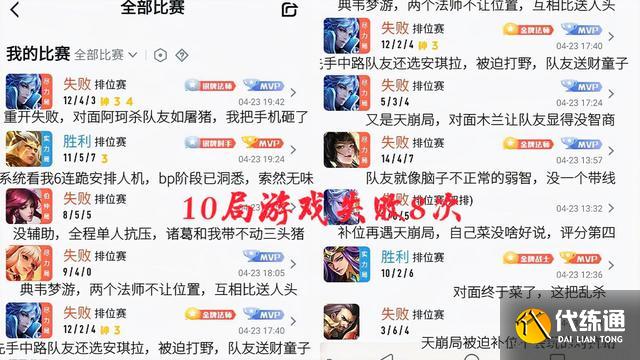 玩家一直是喜欢单排游戏,最近的十局排位赛,出现了各种各样的情况,有的时候自己也能够带飞,但是有的时候战绩并不好看,比如说第1局游戏,玩家因为被迫补位到自己不会玩的对抗路,所以整体的游戏体验并不好,第2局的游戏玩家终于匹配到了比较菜的对手,直接乱杀,第3局游戏,再一次补位到了自己不会玩的对抗路,结果依然是以失败结束,然后直接连跪5局,紧接着又碰到了一局人机对手,轻松的获得胜利,本来段位已经到达了星耀3,经过十局游戏之后,竟然回到了星耀5,一怒之下摔了手机。