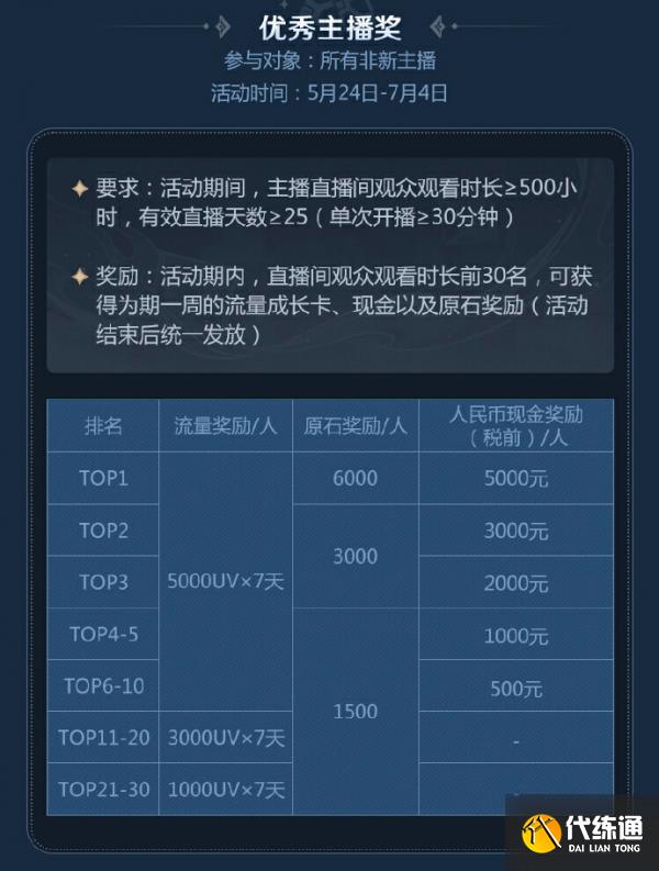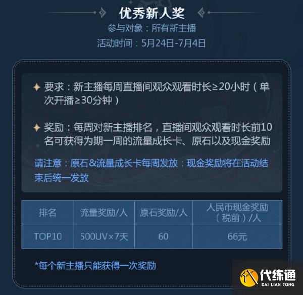 1、优秀新人奖:新人主播完成指定任务即可获得原石、现金以及流量卡奖励!