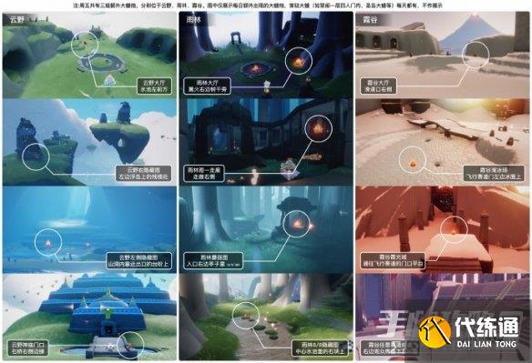 今日大蜡烛位于云野、雨林、霞谷,小伙伴们可以参考下图进行寻找: