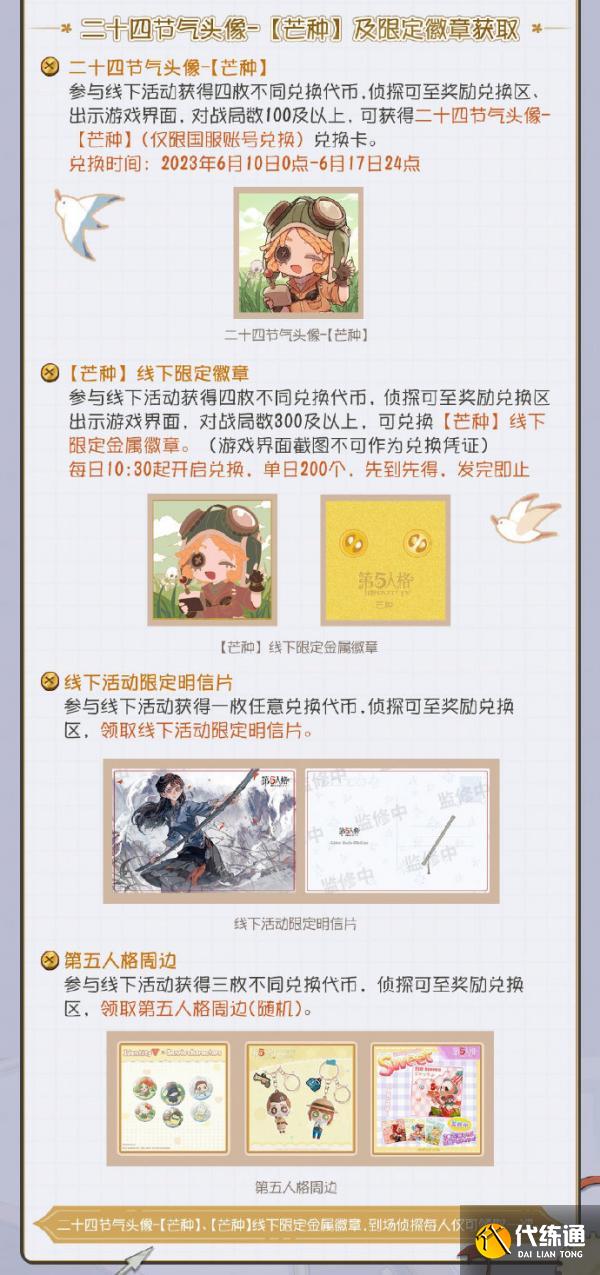 参与现场活动,各位侦探有机会获得二十四节气头像-【芒种】兑换卡、【芒种】线下限量徽章、线下活动限定明信片、第五人格周边等丰富奖励~