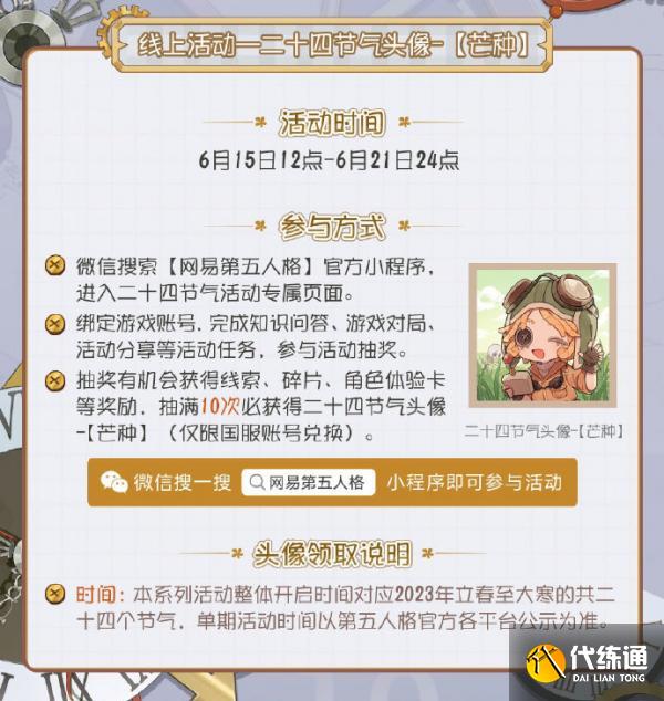 微信搜一搜【网易第五人格】官方小程序,进入二十四节气活动专属页面,绑定游戏账号、参与活动并完成任务,参与活动抽奖,抽满10次必得二十四节气头像-【芒种】。