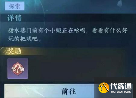 任务详情:甜水巷门前有个小贩正在吆喝,看看有什么好玩的把戏吧。