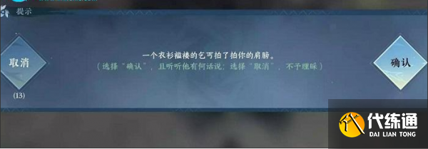 3、这时就会有一个衣衫褴褛的乞丐拍了拍你的肩膀,之后与他进行对话,他要啥你就给啥,对话结束后可以触发奇遇任务。(提示:如果没有乞丐拍你就继续乞讨。)