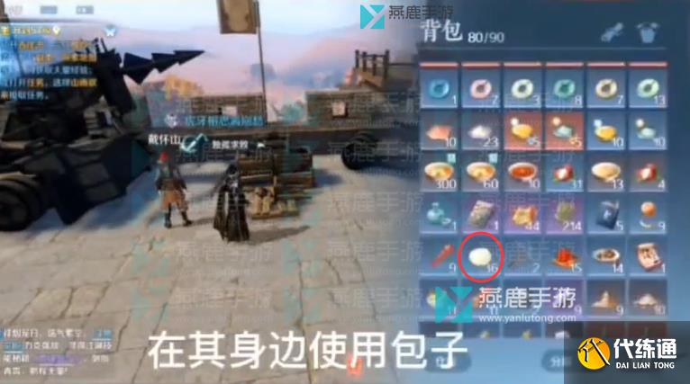 1、前往雁门关,坐标【375,856】,找包子铺npc,对话买包子。