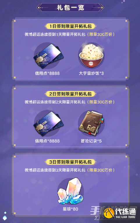 活动期间内,在「崩坏星穹铁道超话」内连续签到1/2/3天,即可领取相应的游戏礼包。