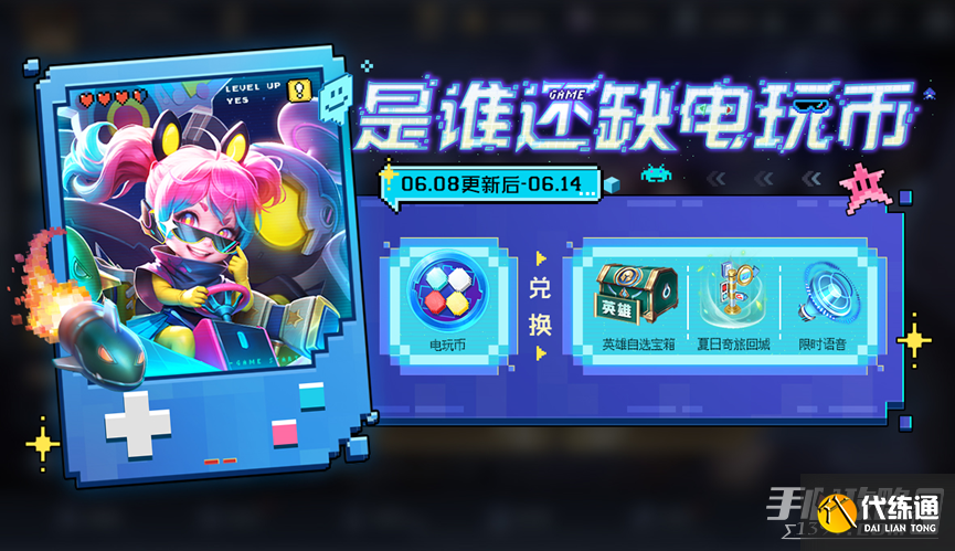 活动期间使用指定英雄参与对局即可领取电玩币。电玩币可前往【电玩峡谷】活动的兑换商店兑换英雄自选宝箱、夏日奇旅回城、限时语音等好礼!