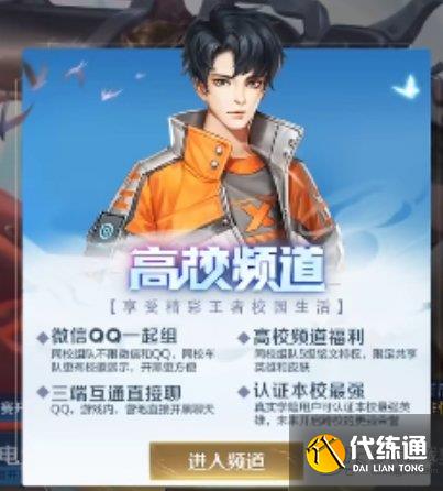1、首先通过上方点击进入高校的认证入口,然后来到王者荣耀校园频道,选择进入频道操作。