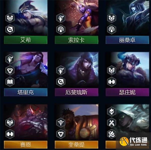 1:阵容由艾希,索卡拉,冰女,宝石,厄斐琉斯,猪妹组成的,如果等级在高的话上五费卡,塞恩,奎桑提,赛娜随意;