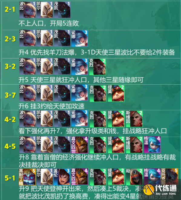 前期:2-1不上人口,开局5连败,2-3升4,优先找羊刀法爆,3-1D天使三星波比不要给2件装备。