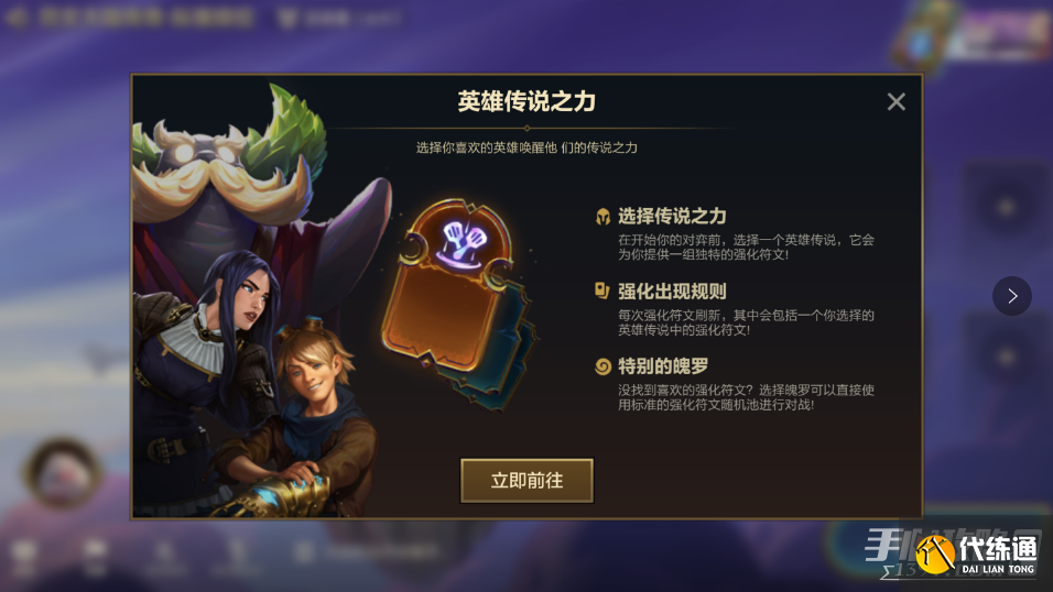 有了英雄传说之力,你就能在战局开始前,对自己拿到的强化符文施加一些影响!从15种独特的英雄传说之力中选择一个,每种都代表着不同的玩法风格。