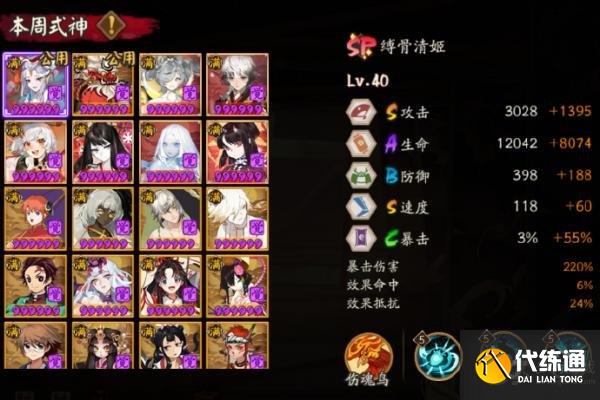 本周特好用式神:sp镜(218抵抗)、sp兔、sp鬼切、炭治郎、万年竹