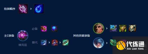 优先做出主C维克兹的法爆与蓝bf。之后补出斯维因的三神装与巨杀。最后补出娑娜的装备。