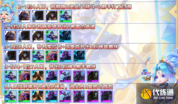 2、阵容羁绊:3巨神4前手2堡垒2弗雷尔卓德2神愉者