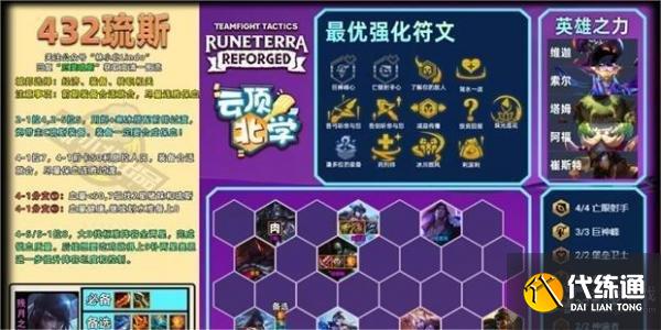美测刚开始前厄斐琉斯这套只需要开2亡射即可,但是厄斐琉斯目前被连续砍了好几刀,反而厄加特被多次加强。如果只靠厄斐琉斯输出,阵容强度是不够的。我们团队经过多把测试,厄加特现在不仅能够充当副坦还有不俗的爆发伤害,常常一个技能冲到对手后排搅局。所以目前来说开4亡射是比较合理的。因为阵容前排的技能基本上都是和护盾有关系,所以阿北选择了开3巨神峰羁绊提高前排坦度,如果大家在实战中觉得阵容坦度够了,也可以下奶妈上冰女开3弗雷尔卓德,提升阵容的控场能力。