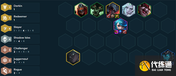 构成羁绊:4暗影岛、1暗裔、1涤魂圣枪、4杀手、2挑战、2战神、2潜行者