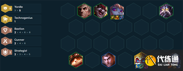 构成羁绊:5约德尔、1大发明家、2壁垒、2枪手、2战略家
