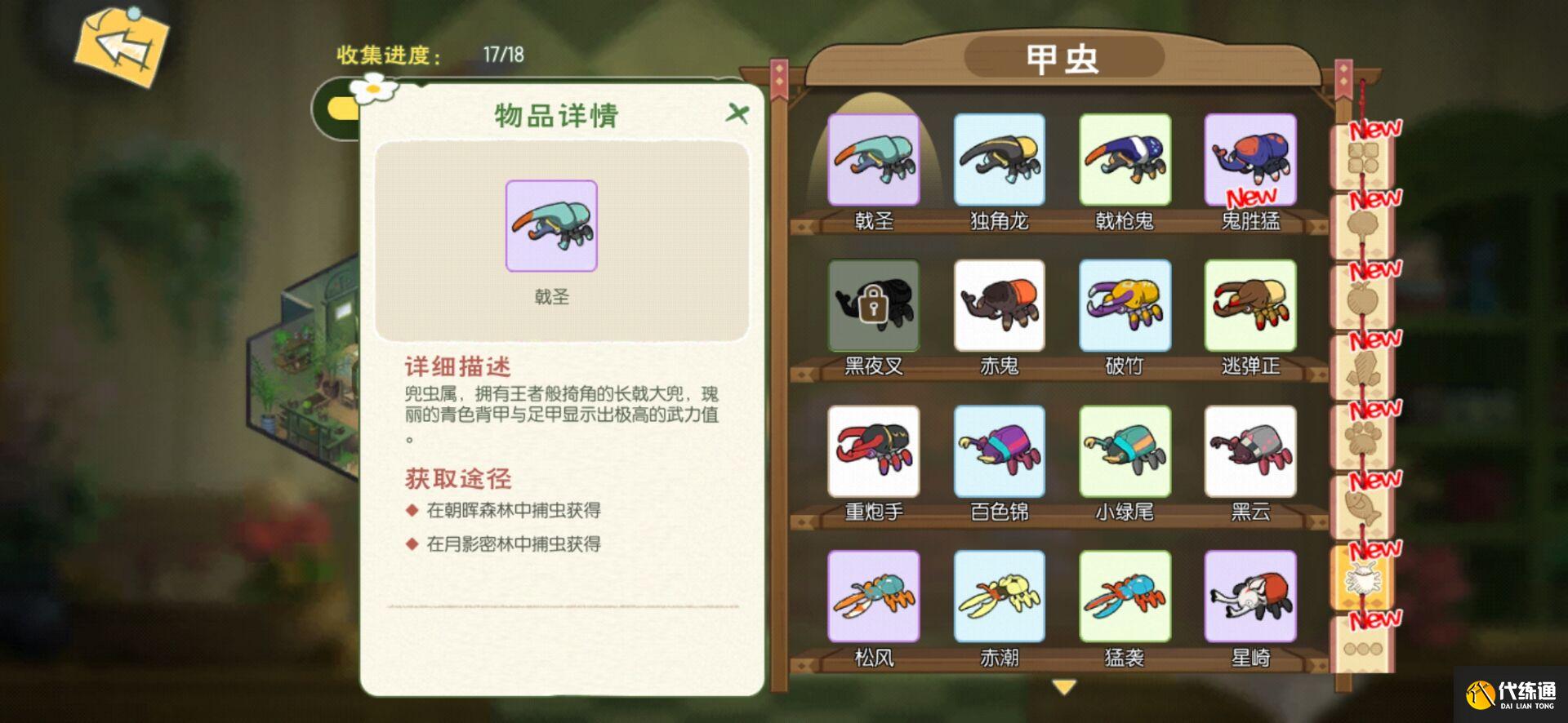 戟圣。它有一把长戟,长有国王般的角,华丽的青色背甲和脚甲显示出很高的力量价值。得之道是在昭惠林捉虫,在月影林捉虫。