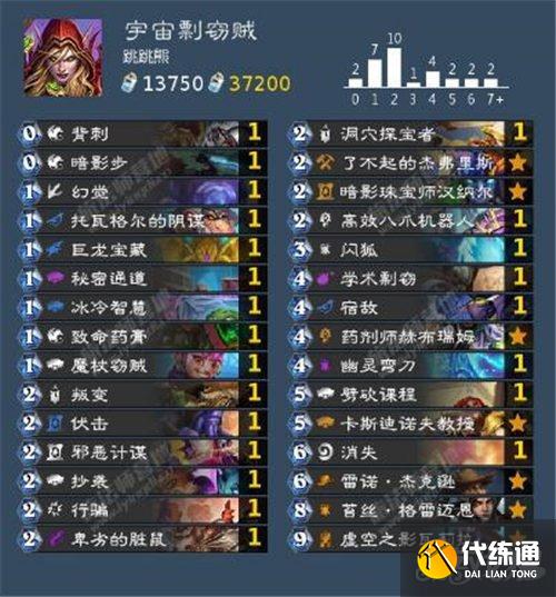 今天给大家带来的是来自跳跳熊的一套宇宙剽窃贼,他在传说分段打出了178场59%的胜率。构筑上与现在狂野天梯上部分偏攻利的节奏剽窃贼不同,属于复古的控制体系偏后期的宇宙剽窃贼,其中包含刀体系,奥秘体系,宇宙剽窃体系,优质节奏解牌和过牌。此外大王的改动对控制体系宇宙剽窃贼是绝对的补强,苔丝消失的高上限可以得到较稳定发挥。卡组小劣极限快攻和爆发卡组,比较怕奥秘吞噬者和信天翁。其余对局笼统来说都是均势或优势。