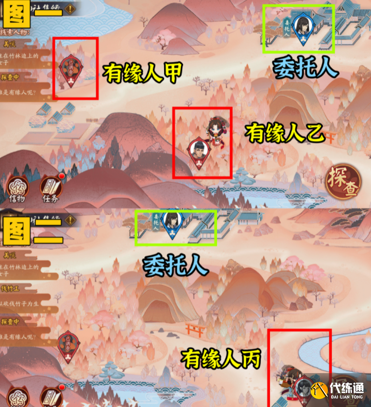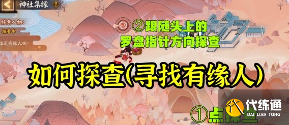 1、进入活动(点庭院小黑猫猫进入)后,点击探查,然后跟随头顶罗盘指针所指方向,寻找有缘人。