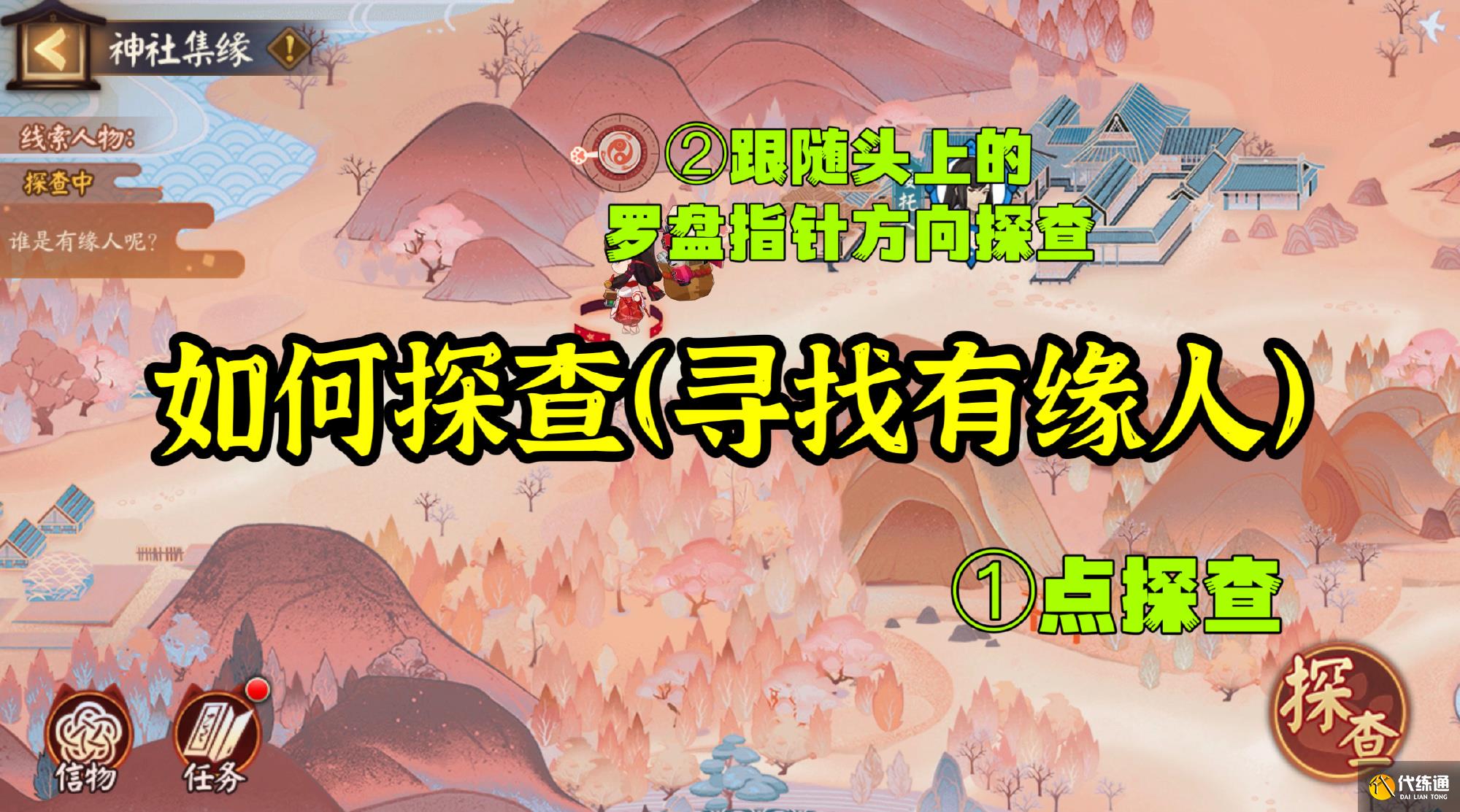 1、进入活动(点庭院小黑猫猫进入)后,点击探查,然后跟随头顶罗盘指针所指方向,寻找有缘人。
