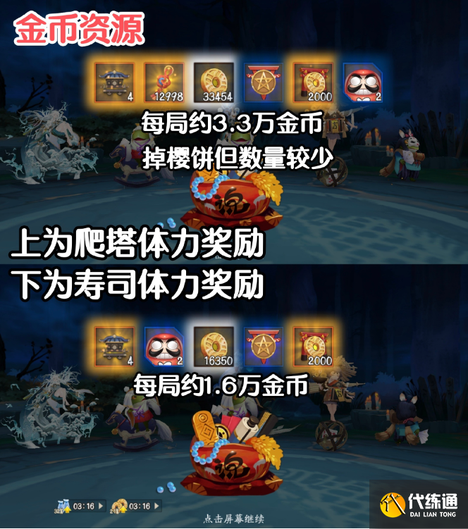 1..每天50个爬塔体力推荐刷【金币/御魂】