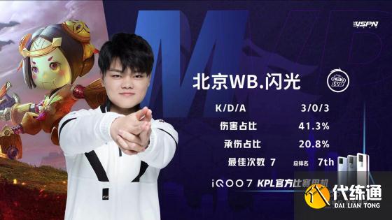 16分50秒,裴擒虎拿下暗影主宰,墨子二技能炮死赵云,鲁班七号扫死姜子牙,17分半,神人关羽黏住君诏刘邦阻止其回家,LGD再掉中路高地,墨子大闪控住孙尚香,孙尚香翻滚一枪将其带走,孙尚香换出复活甲将输出打满拿到双杀再接一枪打出鲁班七号复活甲,无奈此时裴擒虎已经带着中路兵线点掉了LGD水晶,WB战胜LGD。本局最佳给到北京WB.闪光的鲁班七号